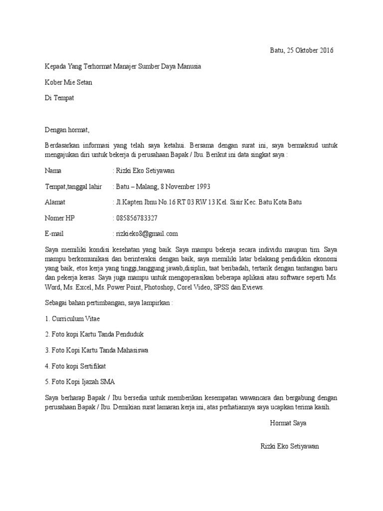 Contoh surat lamaran kerja umum, simple, tulis tangan, terbaru, yang baik dan benar terlengkap ini saya buat kepada para pencari kerja agar bisa digunakan untuk melamar pekerjaan diperusaaan sesuai dengan posisi yang dibutuhkan oleh perusahan yang sedang membuka lowongan pekerjaan. Banyak kesalahan dari surat lamaran kerja yang kita buat adalah dari struktur dan bahasanya, maka dari itu. 1 contoh surat lamaran kerja. Ada beberapa cara yang efektif agar surat lamaran kerja di café/restoran agar dapat diterima. Berikut ini adalah beberapa contoh surat lamaran kerja yang dapat anda jadikan sebagai inspirasi untuk mulai menulis surat lamaran kerja anda.